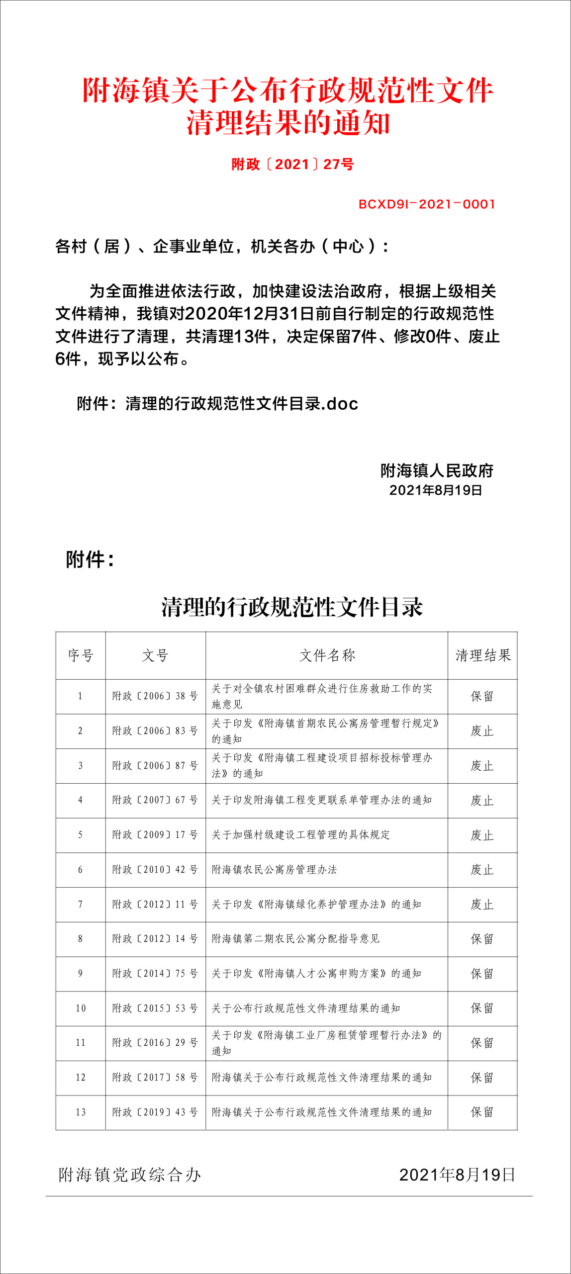 附海鎮關于公布行政規范性文件清理結果的通知圖解